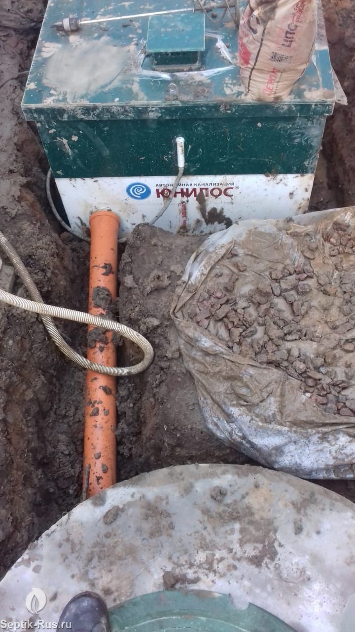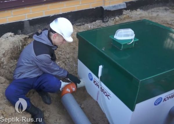 Подводящая труба должна входить в емкость станции на глубине 45 - 60 см, отводящая может быть расположена в 60 см от поверхности грунта. Срок эксплуатации септика – более 50 лет.