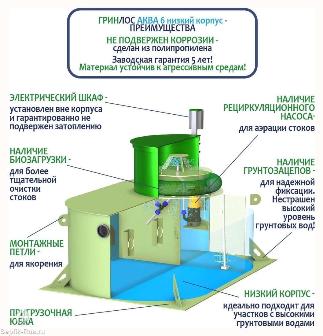 Отличительными особенностями септика ГРИНЛОС Аква 6 низкий корпус являются: