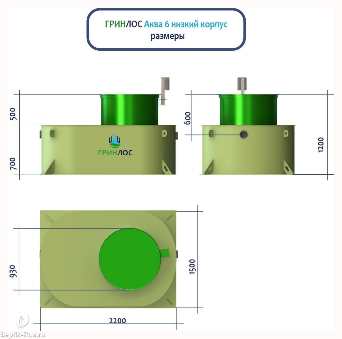 ГРИНЛОС Аква 6 низкий корпус - это самотечная модель септика с уменьшенной высотой корпуса. Обладает объемом залпового сброса 540 л. и производительностью 1,2 м3/сутки, что делает его подходящим для домов, в которых число жильцов не превышает 6 условных пользователей.