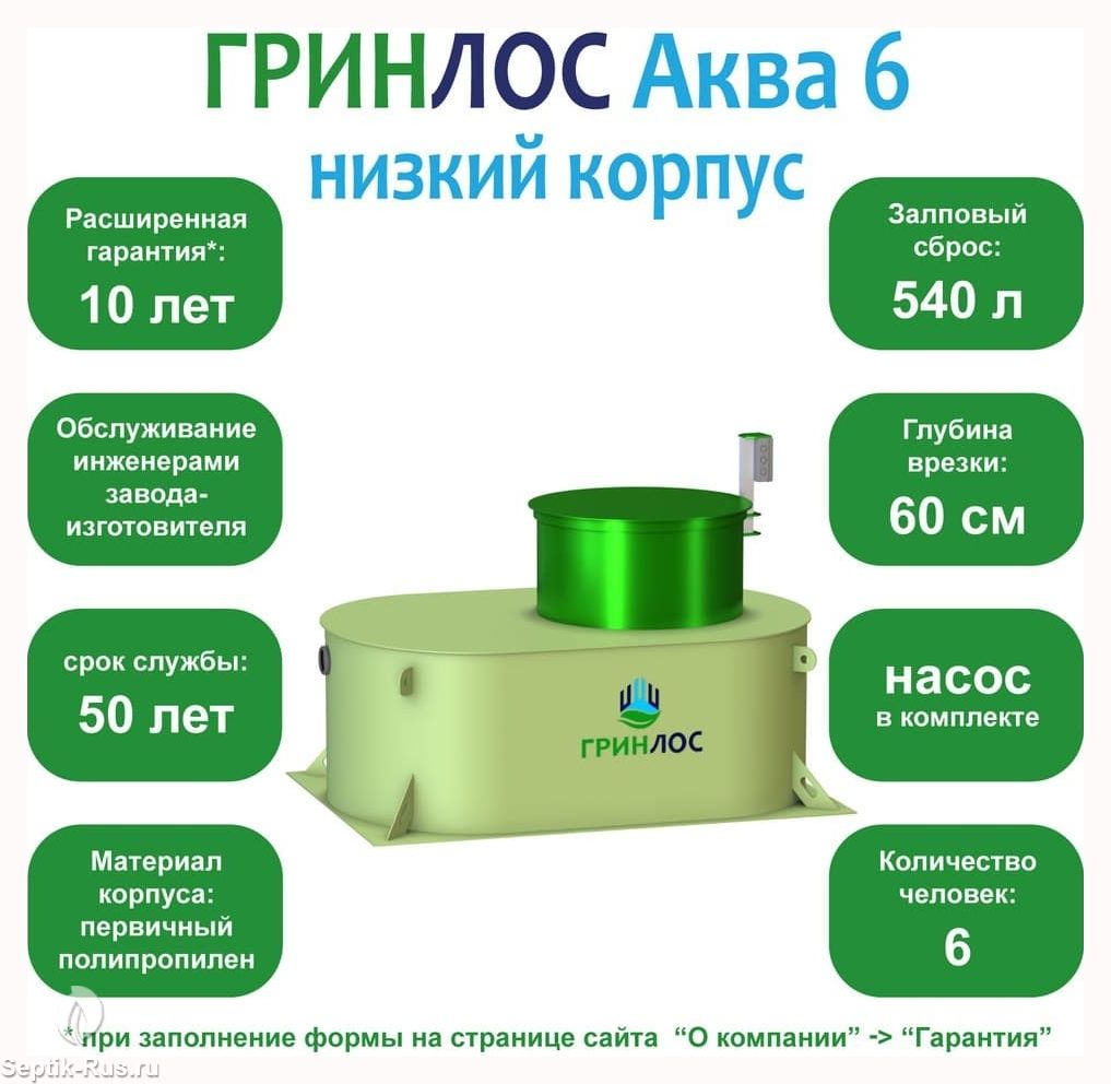 Доставим и установим септик ГРИНЛОС Аква 6 низкий корпус за 1 день по цене ниже конкурентов и скидкой на монтаж до 29%. Звоните!