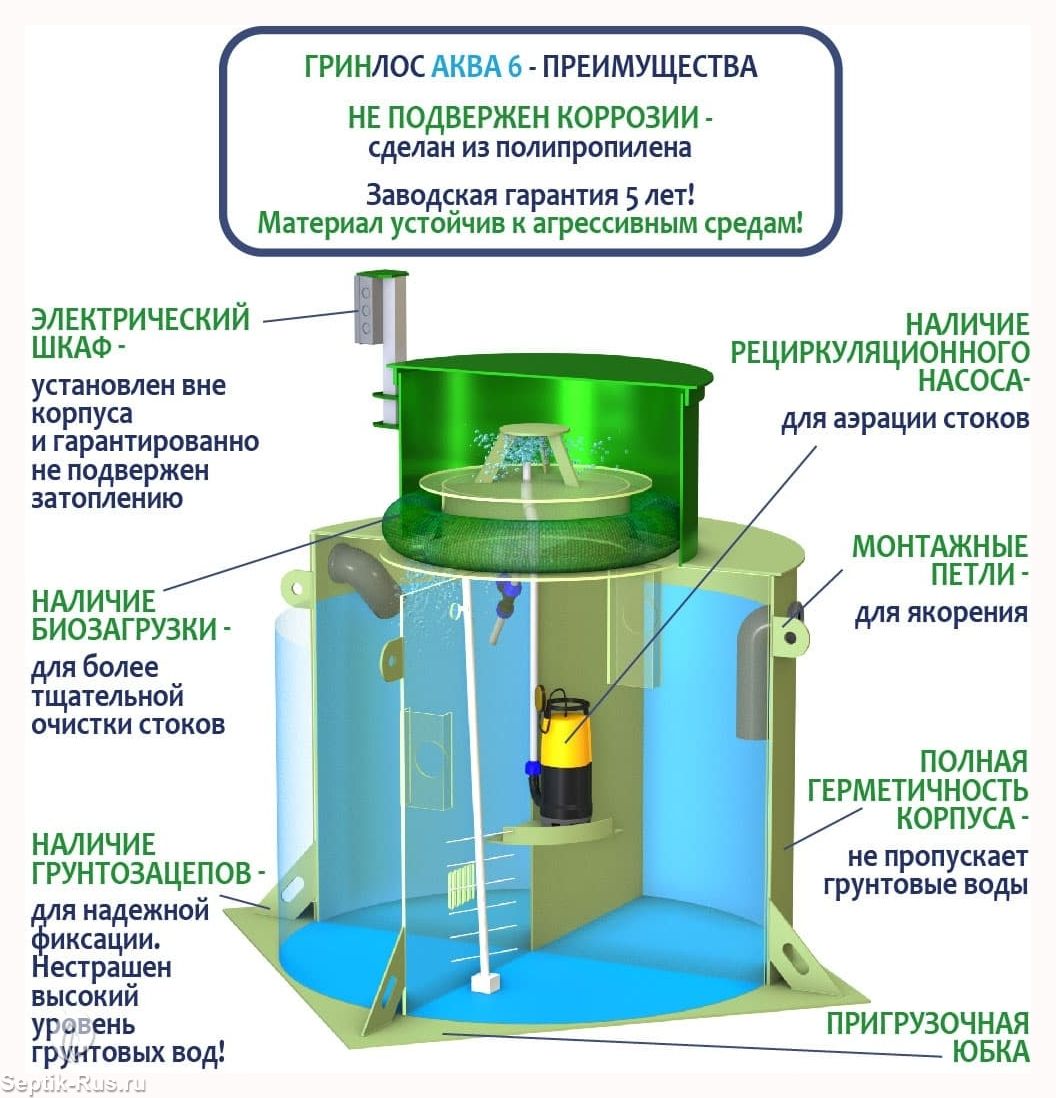 ГРИНЛОС Аква 6 изготавливаются из полипропилена чешского производства. Нижний уровень разделен на четыре отсека со специальными технологическими переливами. Перетекая из одного отстойника в другой, стоки проходят первоначальный процесс отстаивания, усреднения стоков, отделения нерастворимых фракций (жиров и т.д.), которые остаются в первом отсеке. При этом уже в первом отсеке начинается очистка стоков свободным активным илом. Затем, из третьего отсека, стоки посредством дренажного насоса подаются на верхний уровень, на специальный разбрызгиватель, через который происходит орошение биофильтра.