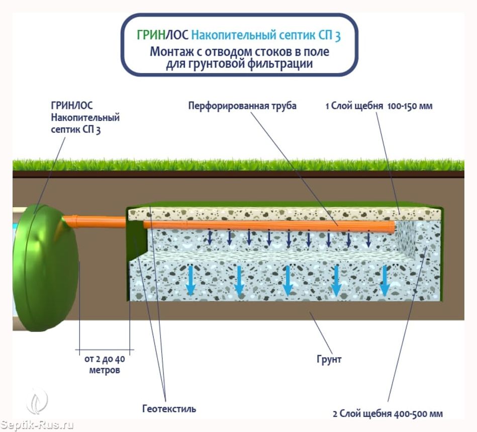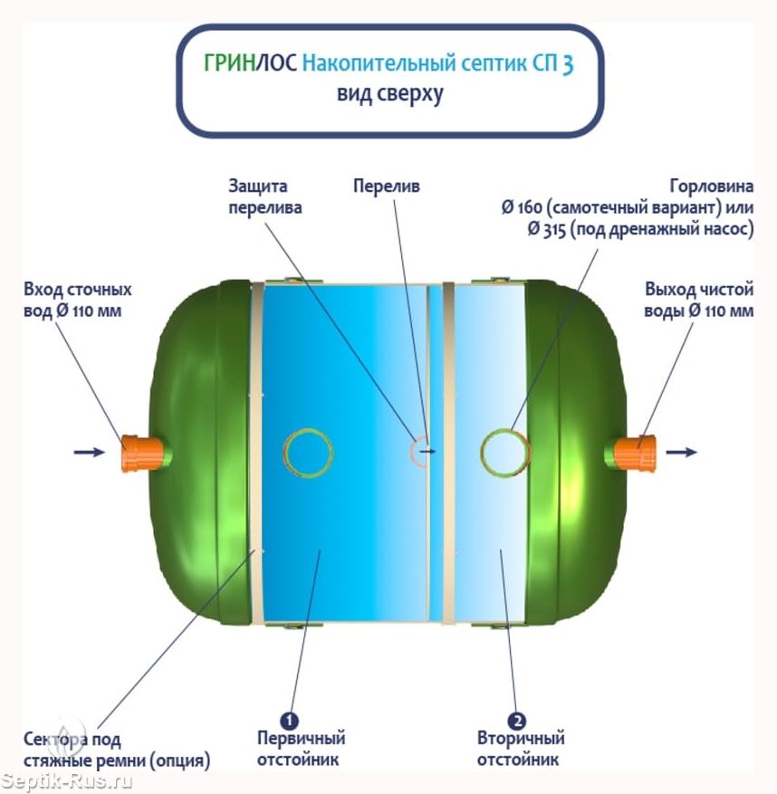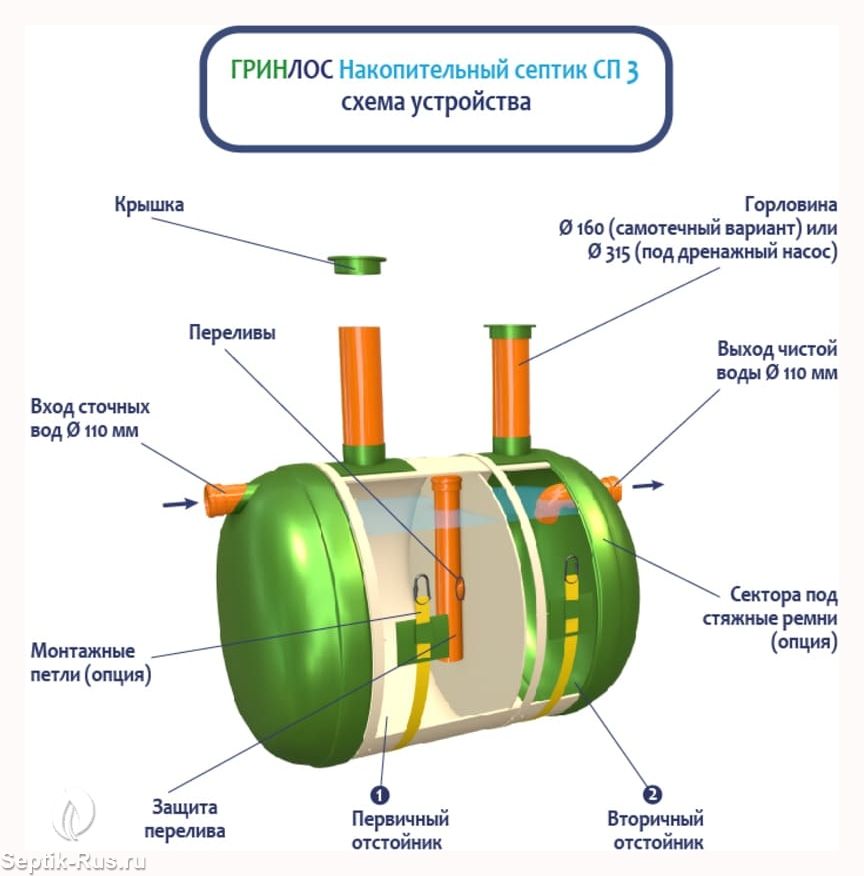 Герметичная конструкция Гринлос Накопительного септика СП 3 исключает трещины и разгерметизацию, защищая окружающую среду и здоровье людей. Грунт и подземные воды надежно защищены от загрязнений, предотвращая неприятные запахи и попадание вредных веществ.