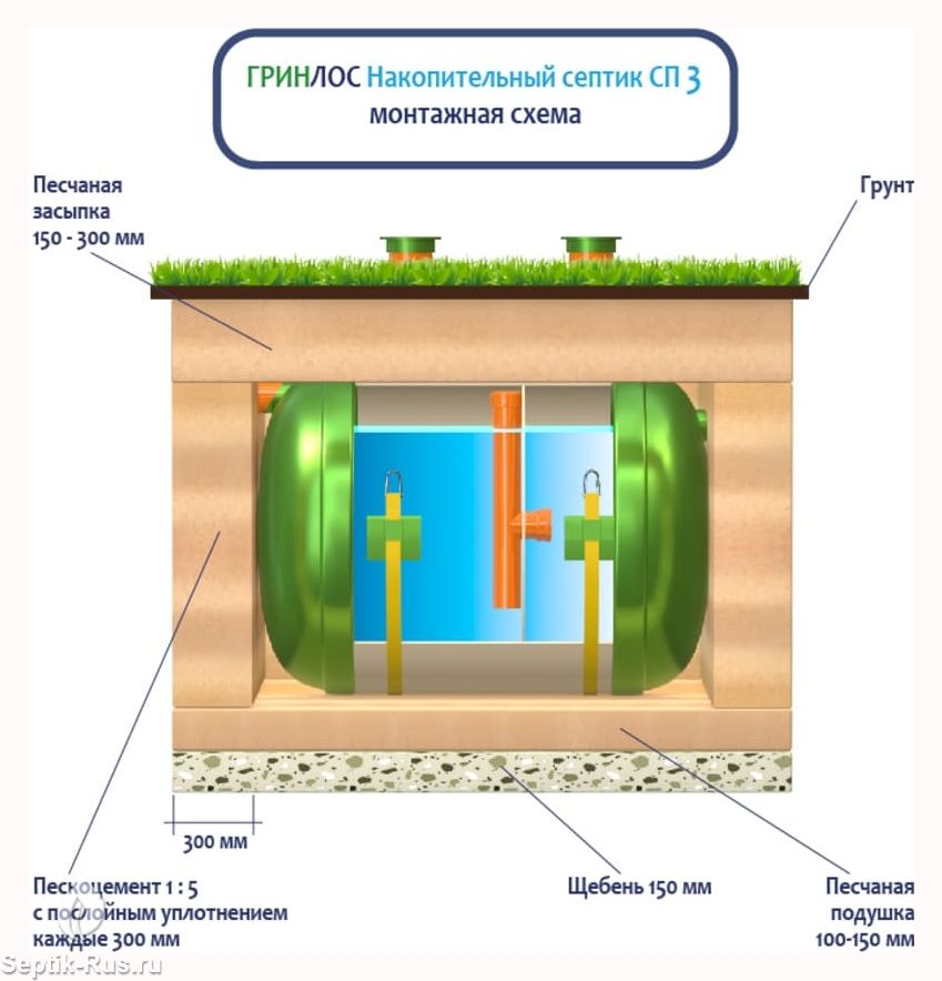 Поверх корпуса оборудования насыпается песчаный слой высотой 150-300 мм. Для подключения оборудования к внутренней канализационной системе используются предназначенные для этого канализационные трубы.