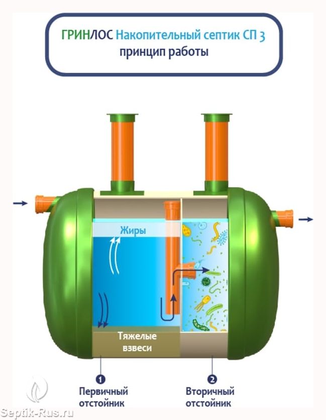 Септик обеспечивает поэтапную очистку сточных вод с разделением на фракции. Возможность использования биоферментных препаратов повышает эффективность и скорость очистки, что обеспечивает быструю обработку и отведение очищенных стоков.