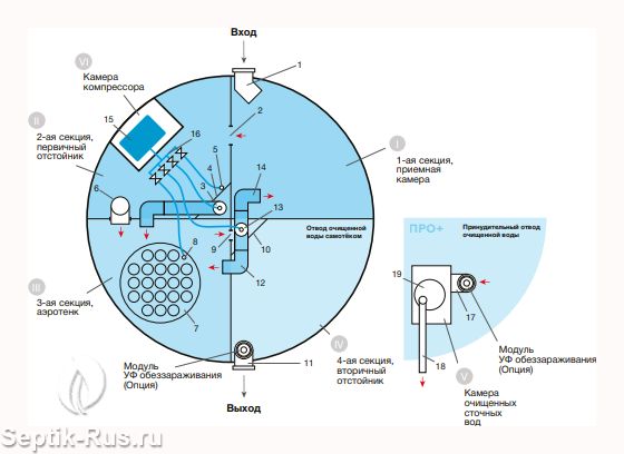 Схема с отводом очищенных сточных вод в дренажный элемент. Подходит для хорошо впитывающих грунтов (песок, супесь) и низкого уровня грунтовых вод. (возможен только через блок доочистки)