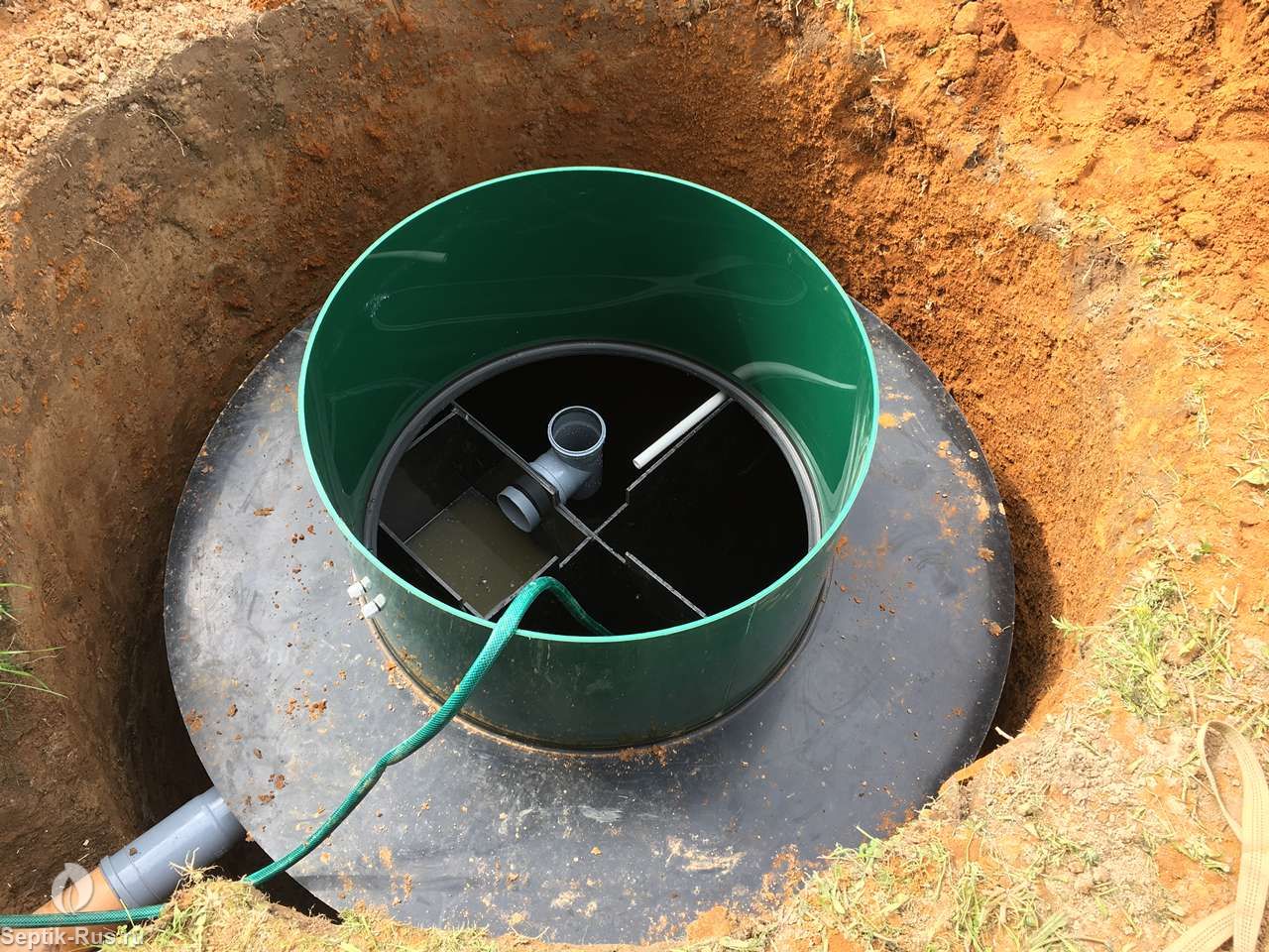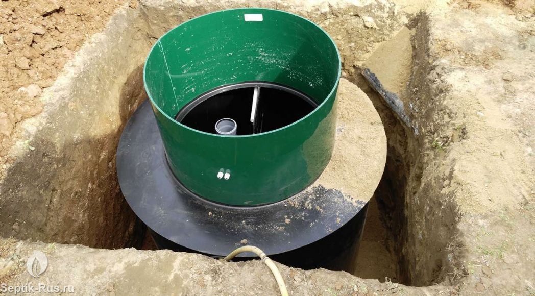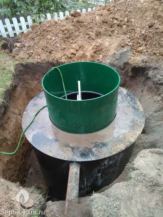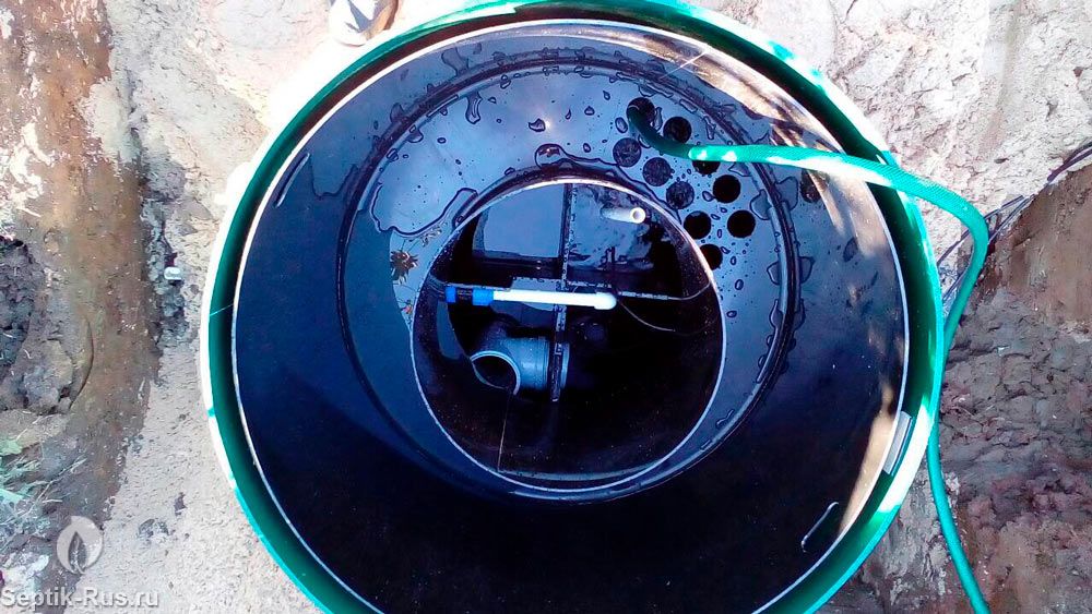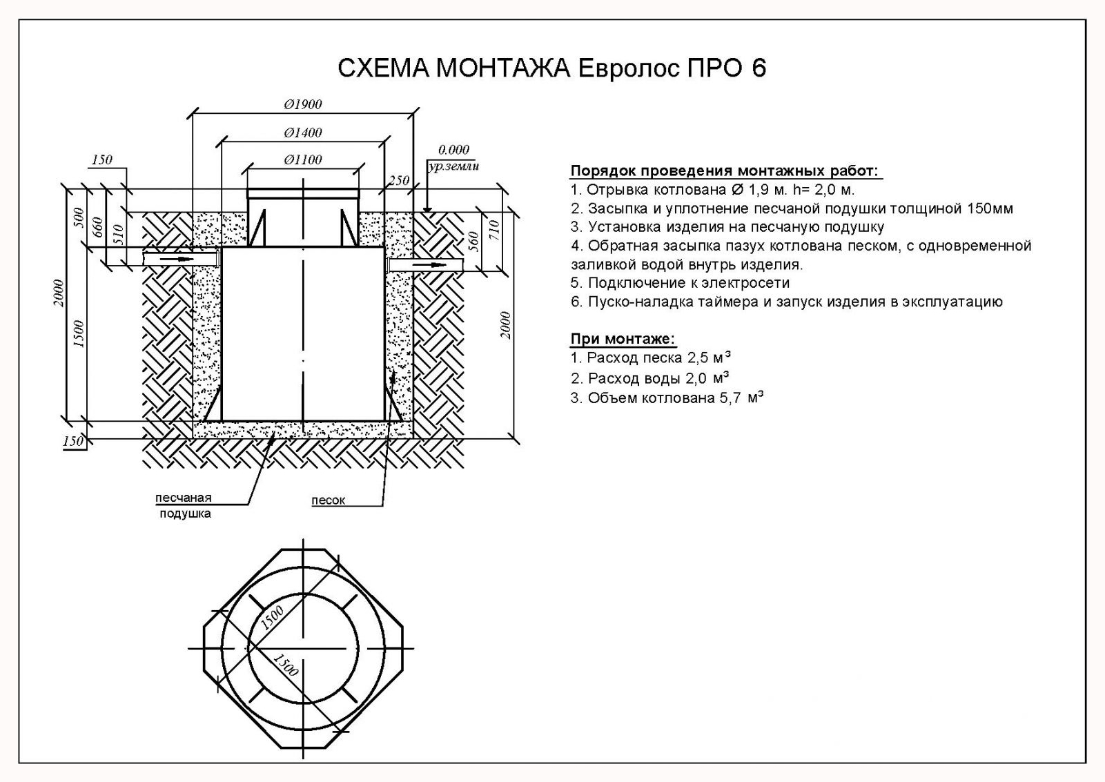 Схема с отводом очищенных сточных вод в фильтрующий колодец. Подходит для хорошо поглощающих грунтов (песок, супесь) и низкого уровня грунтовых вод.